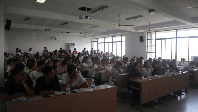 首先,杨杰老师现场深情诵读了流沙河的《理想》一文:“理想是石,敲出星星之火/理想是火,点燃熄灭的灯/理想是灯,照亮夜行的路/理想是路,引你走向黎明”。寥寥四行诗句,勾起了同学们对诗和远方的无尽向往,将讲座现场的气氛引入了高潮,同学们纷纷被杨杰老师的魅力所折服。杨杰老师引导学生将理想与现实、个人理想与社会理想紧密结合,通过陈毅元帅的诗歌与事例,以生动的语言进行描述,勉励新生们要有崇高的理想信念。既要仰望星空,又要脚踏实地;既要独善其身,更要在能力足够的前提下兼济天下。鼓励新生们努力丰富自己的精神世界,为实现中国梦、实现中华民族伟大复兴、最终实现共产主义远大理想而贡献自己的一份力量。最后交流环节,同学们积极的向杨杰老师表达心中的感受和疑惑,杨杰老师的阐释和悉心指导为法学院新生们点燃了一盏明灯,为新生们指明了方向。
