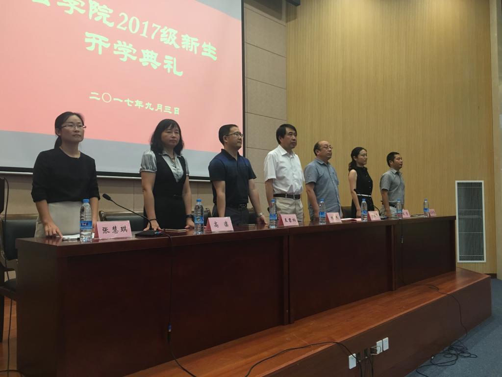 法学院2017级新生开学典礼于9月3日下午四点在商院学术报告厅隆重举行。法学院党委书记杨杰、法学院院长曾祥华、副院长王君柏、副院长王芳、党委副书记张慧琪、教师代表高凛、汪冬冬,以及各级辅导员和新生班主任出席了此次新生开学典礼。